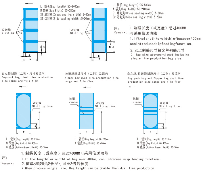 產(chǎn)品用途: 該機(jī)適用于以BOPP、OPP、CPP、PE、尼龍、鋁箔、紙張為基材的兩層或多層三邊封復(fù)合薄膜袋(食品袋、洗衣粉袋、糖果袋等)的生產(chǎn),有上拉鍵和生產(chǎn)自立袋功能,本設(shè)備操作簡(jiǎn)便,產(chǎn)品平整,形狀美觀,封邊處熱合強(qiáng)度高,制袋速度快是理想的包裝制袋設(shè)備。產(chǎn)品特點(diǎn): 1、整機(jī)采用進(jìn)口PLC,人機(jī)界面集中控制。性能穩(wěn)定,易于操作、維護(hù)。操作界面中、英文可互相切換。2、放料交流變頻電機(jī)自動(dòng)送料,速度與主機(jī)同步,恒張力控制。 3、主料放卷為水平式氣脹輥放卷,氣動(dòng)鎖定。K形折料架,LPC自動(dòng)糾偏。 4、輔料放卷為水平式氣脹軸放卷,三角板折料,恒張力控制。 5、送料牽引為進(jìn)口三伺服電機(jī)驅(qū)動(dòng),張力浮輥控制,動(dòng)態(tài)補(bǔ)償。 6、上、下封壓采用進(jìn)口伺服電機(jī)驅(qū)動(dòng),燙壓時(shí)間可按制袋燙壓要求設(shè)定,氣缸提拉式倍送功能。 7、二排橋式鏈封,五排橋式邊封,五組底封及其循環(huán)水冷卻結(jié)構(gòu)。 8、燙壓刀溫度采用PID調(diào)節(jié),0~300℃可調(diào),無(wú)觸點(diǎn)自動(dòng)控制,人機(jī)界面集中設(shè)定。 9、多功能氣動(dòng)沖孔裝置,廢邊料切除自動(dòng)收取,靜電消除裝置。 10、沖孔方式:可設(shè)置連續(xù),間隔,停止,沖孔時(shí)間可預(yù)置。 11、計(jì)數(shù)方式:數(shù)量、批數(shù)自動(dòng)累計(jì),具有預(yù)置功能。 12、批送功能:工作臺(tái)具備批送功能,批送數(shù)量可預(yù)置。 13、工作方式:定長(zhǎng)制袋,光電跟蹤制袋,點(diǎn)料自動(dòng)尋標(biāo)功能。 14、倍送方式:一至六倍送。 15、伺服電機(jī)過(guò)載保護(hù),放卷無(wú)料自動(dòng)停機(jī)。 穿膜圖: