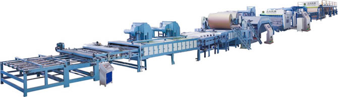 設備特性: 一、 自動化程度高,工藝損耗很低,蜂窩紙板成品率達98%,是具有高科技含量的設備。 二、 操作簡單,計算機觸摸屏控制,在國內率先實現了從進紙到成品連續化的生產。 三、 全電腦控制,采用了國際上較先進的涂布技術,集機、氣、光電于一體,品質性能穩定可靠。 四、 在設計上有較大的技術突破,更趨于合理性,出材率高,成本大幅度下降單班4-5人可產 6000m2以上。 五、 無塵、無味、無污染,符合環保要求。 六、 無中間環節,全程控制,大大減少了人工勞力,真正實現了全自動生產。 工藝流程: 多卷同時上紙―>涂膠線―>復合并烘干―>橫切―>自動收集―>紙芯拉開―>紙芯烘干―> 紙芯涂膠―>放面紙―>面紙復合―>冷壓―>烘干―>壓平―>冷卻―>切斷―>收集